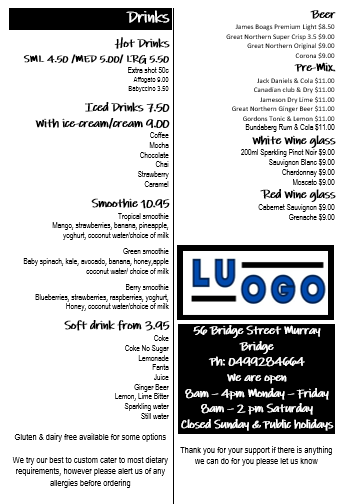Welcome to Luogo, a delightful country café nestled at 56 Bridge St, Murray Bridge. A perfect spot for breakfast or a quick coffee break, Luogo blends modern charm with a warm atmosphere. Their menu boasts a diverse array of options, including refreshing iced drinks like Iced Strawberry and creamy Iced Chai. For those craving something more substantial, the selection of wraps and salads—such as the Pumpkin Salad and the Halloumi Avocado Chicken Salad—are sure to please. Reviewers have raved about the excellent coffee, while hearty comfort food like the Old Fashion Burger and Baked Spud make every visit a treat. With accolades highlighting the friendly service and generous portions, visitors leave satisfied, eager to return for more culinary delights. Whether it's a casual brunch or a coffee run, Luogo ensures a memorable dining experience!